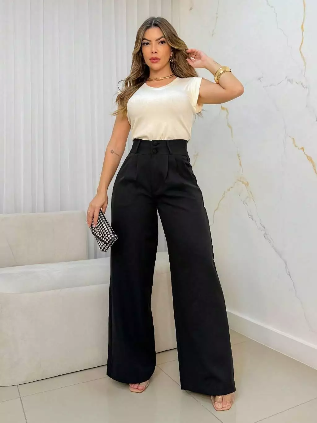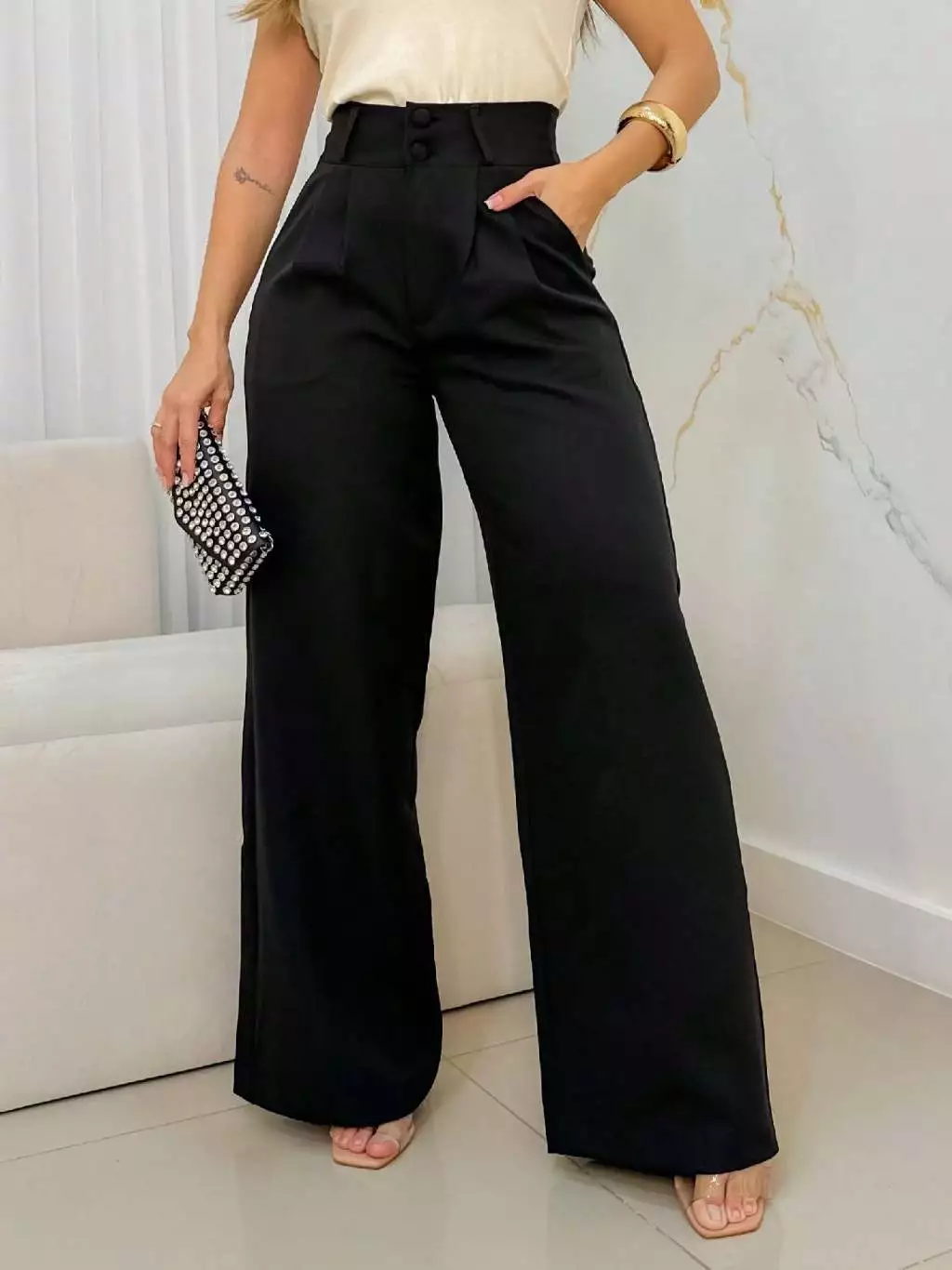 A calça de cintura alta ajuda a alongar a silhueta e oferece um ajuste mais confortável e elegante.