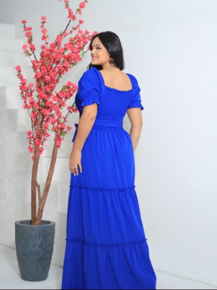 Vestido Longo Evangélico Feminino com Cinto manga bufante e elastex ajustado ao corpo